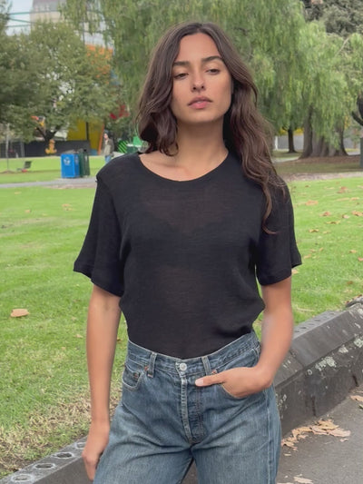 This T-Shirt is one we released many years ago and has been our mostly highly requested piece to bring back, so we're finally re-cutting some more! This stunning fabric is knitted in a boutique mill in Melbourne and is the most special, floaty fabric that feels heavenly soft on the skin. It has a beautiful drape on the body and is ever so slightly see through, but in a good way.